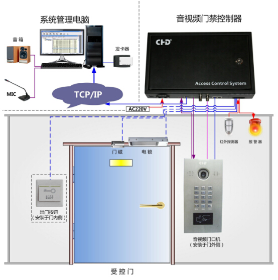 人员欲通过受控门,进入时需在受控门外侧门口机上刷卡(刷卡+密码、双卡),控制器、系统判断是否为有效合法卡,中心通过监控画面监控本地,有效则驱动电锁打开,开门放行;无效则拒绝开门并报警,人员无法通过。出门时需在受控门内侧读卡器上刷卡(刷卡+密码、双卡)或按出门按钮,控制器、系统判断是否为有效合法卡,有效则驱动电锁打开,开门放行;无效则拒绝开门并报警,人员无法通过。